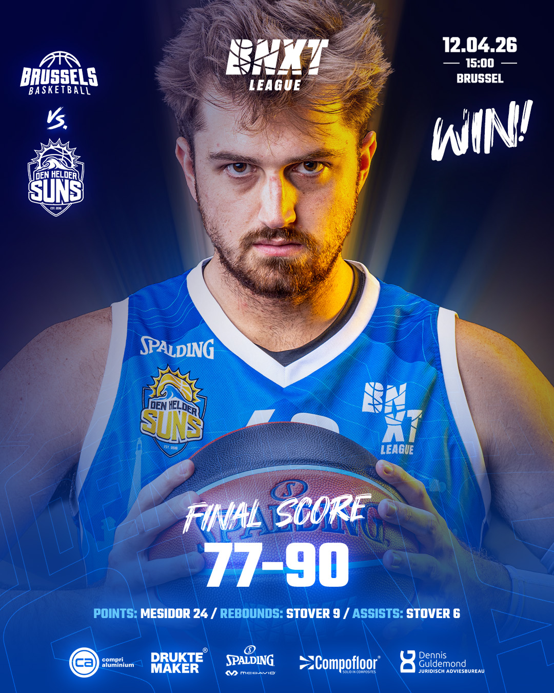 De Den Helder Suns hebben zondagmiddag een knappe overwinning geboekt in de BNXT League. In België werd voor het eerst gewonnen van Brussels Basketball: 77-90. Daarmee zetten de Suns niet alleen een sterke prestatie neer, maar doen ze ook uitstekende zaken in de strijd om thuisvoordeel in de play-offs.